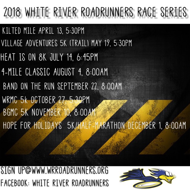 The White River Road Runners 2018 Challenge Series currently includes 8 races. "Iron Roadrunners" will be those completing 7 of the 8 from the schedule. Awards will also be presented to the Top 3 in the following age groups: 13 to 19, 20 to 29, 30 to 39, 40 to 49, 50 to 59, 60 to 69, 70 and up.