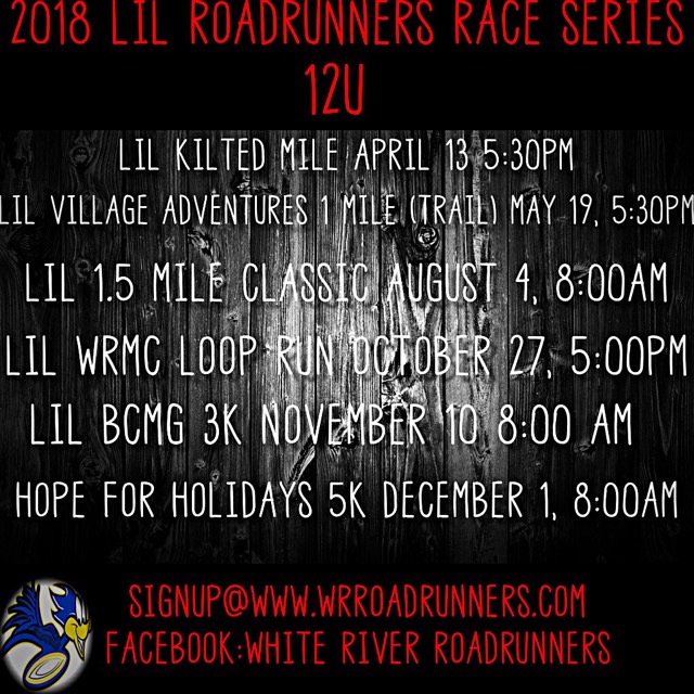The White River Road Runners 2018 Challenge Series currently includes 8 races. "Iron Roadrunners" will be those completing 7 of the 8 from the schedule. Awards will also be presented to the Top 3 in the following age groups: 13 to 19, 20 to 29, 30 to 39, 40 to 49, 50 to 59, 60 to 69, 70 and up.